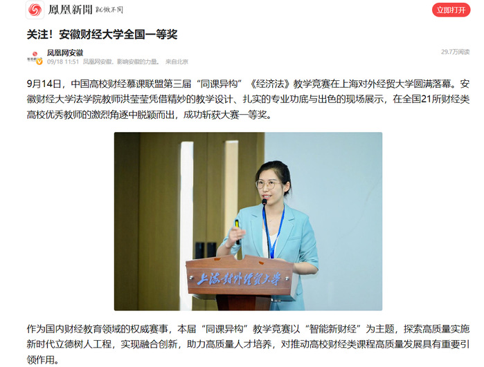 9月18日,凤凰网以“关注!乐竞在线注册全国一等奖”为题,报道我校法学院教师洪莹莹在中国高校财经慕课联盟第三届“同课异构”《经济法》教学竞赛中,斩获大赛一等奖。