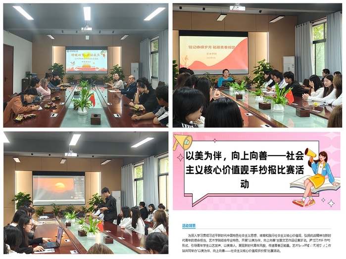 为深入学习贯彻习近平新时代中国特色社会主义思想,培育和践行社会主义核心价值观,艺术学院结合专业特色,开展了“以美为伴,向上向善——社会主义核心价值观手抄报”比赛。同学们以画笔勾勒爱国情怀,用色彩渲染时代担当,将“抗战精神”“青春使命”等主题融入艺术创作,展现了新时代青年以艺发声、以美育人的精神风貌。活动得到了同学们的积极响应,一幅幅色彩斑斓、内容丰富的手抄报作品,不仅展现了新时代青年的艺术才华,更传递了青春正能量,彰显了青年学子的家国情怀。