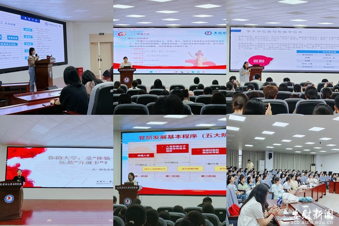 系列活动紧密围绕新生入学阶段的实际需求,聚焦思想引领、学业发展、心理健康与校园融入等重点领域,在博雅楼二楼报告厅集中开展。辅导员工作室充分发挥专业优势与育人专长,围绕多个主题展开系统讲解:“知行领航”生涯规划与就业指导工作室负责人宗惠以专业认知与学业规划为重点,帮助学生构建专业框架、明确学习路径;“先锋筑梦”党员工作室负责人陈媛媛、张欣然共同讲解学生党员发展流程,增强学生的政治意识与组织归属感;“知行领航”生涯规划与就业指导工作室负责人张洁茹深入解析考研、保研与出国等深造途径,拓展学生发展视野;“会乐驿站”工作室负责人程品品结合学院心理健康教育工作,普及心理调适方法,提升学生心理素养;“会乐驿站”工作室成员张莉现场演示易班平台操作流程,强化学生的融媒体应用能力;“会乐驿站”工作室成员赵珂珂全面介绍资助政策与奖助学金机制,营造公平透明的育人环境。
