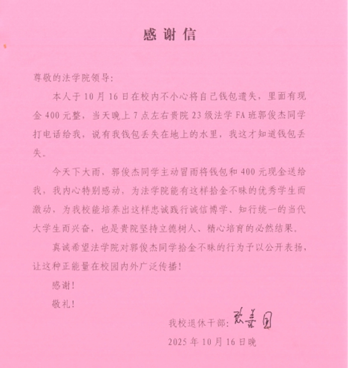 10月17日,张善国同志在夫人的陪同下专程前往法学院,亲手递交感谢信。信中,对郭俊杰同学拾金不昧的高尚品德给予高度评价,并致以诚挚谢意。他深情表示,这一善举不仅体现了学生个人的道德修养,更折射出法学院立德树人工作的扎实成果。