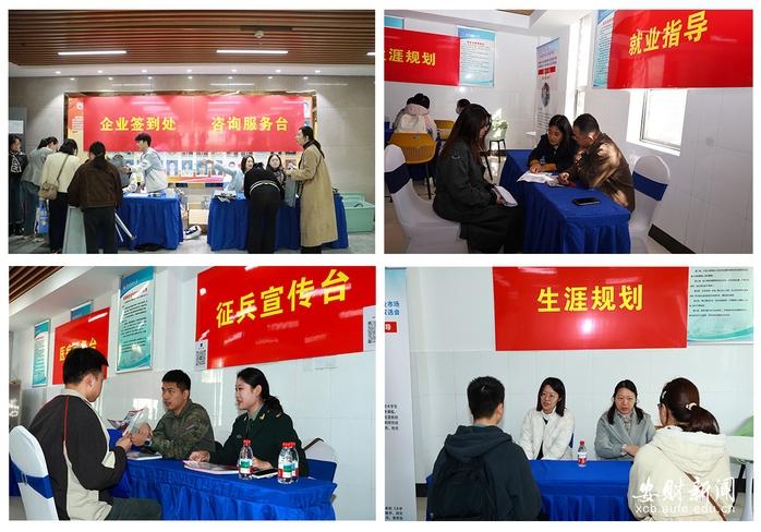 为提升对接效率,双选会创新设置特色专区,其中蚌埠市、马鞍山市、界首市人社部门组团携地方重点企业参会,开设阿里电商合作商家专属招聘区域,精准匹配学校财经、管理、电商等优势学科人才培养方向。行业涉及制造业、金融业、信息传输、软件和信息技术服务业等,岗位涵盖经济金融、数字商务、财务管理等多个领域,与毕业生专业需求高度契合。现场还设有生涯规划、简历门诊、征兵宣传、求职补贴政策等咨询专区为学生提供生涯规划指导、简历优化、政策解读等一站式服务,重点解读基层就业学费补偿、留皖就业补贴等政策。